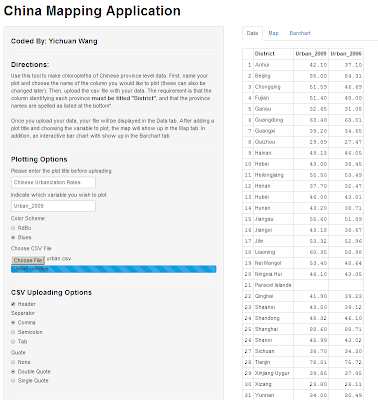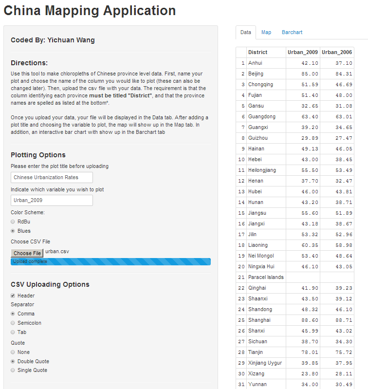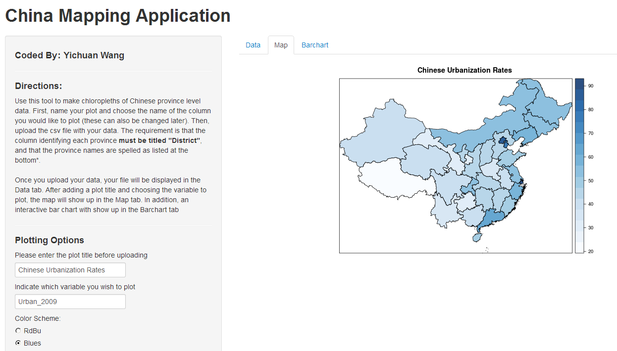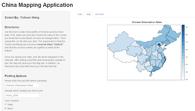 In this process of working with Chinese data, I was faced with the task of analyzing a lot of spatial data about Chinese provinces, and in this process I had to write a lot of R code. After a while, I got annoyed by how long the process would take, and as a result I took the liberty of designing an R Shiny application to help do some of the heavy lifting. Fortunately, these applications are all hosted on the cloud, and you can find the China Mapping Application here: