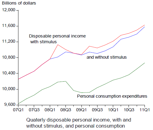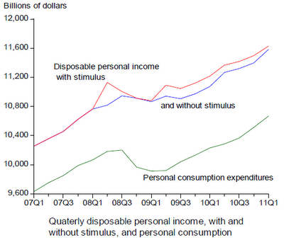 First, he shows that personal consumption doesn't appear to have been much affected by the tax rebates and transfer payments that made up a big chunk of the stimulus:
