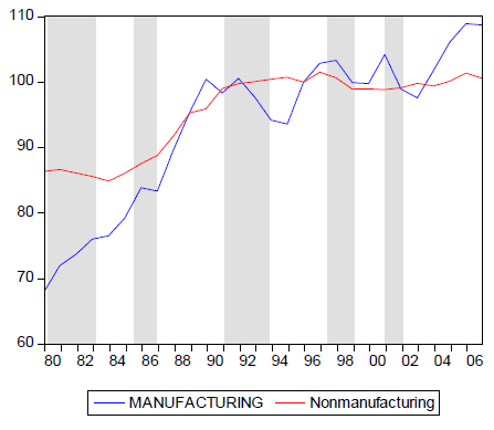 ReplyDeleteThere was also a small rise in employment-population ratio (JPNEPP, JPNEPRNA) from 2003 to 2007, and a rise manufacturing employment as a percentage of the total from 2005 to 2007 (JPNPEFANA).