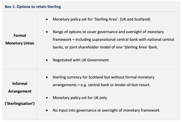 "The Austro-Hungarian monetary union was not the result of a monetary marriage but the by-product of a fiscal divorce. Austria and Hungary became in 1867 two sovereign budgetary entities. In the process, they retained a common bank of issue and thus formed a defacto monetary union that would operate until its post-World War I collapse."A Sterling Area currency union with an independent Scotland would likewise be a product of divorce, not of marriage. An annex to the Scottish Fiscal Commission Working Group's First Report assessing possible currency options for an independent Scotland notes that there are two ways to retain Sterling: through a formal monetary union or through an informal arrangement ("Sterlingisation.") The Scottish Parliament is in favor of the formal monetary union, in which the Bank of England would make monetary policy decisions in consideration of conditions in both Scotland and the rest of the UK.